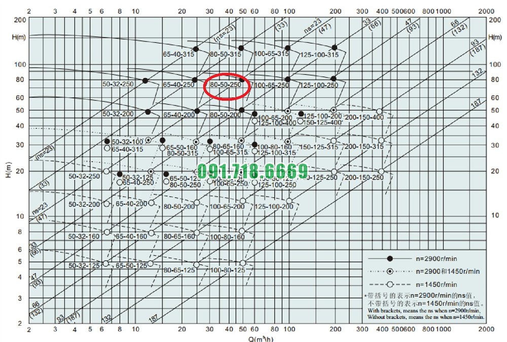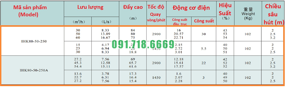 Bảng lưu lượng của bơm li tâm cánh hở công suất 30 kw model IHK80-50-250