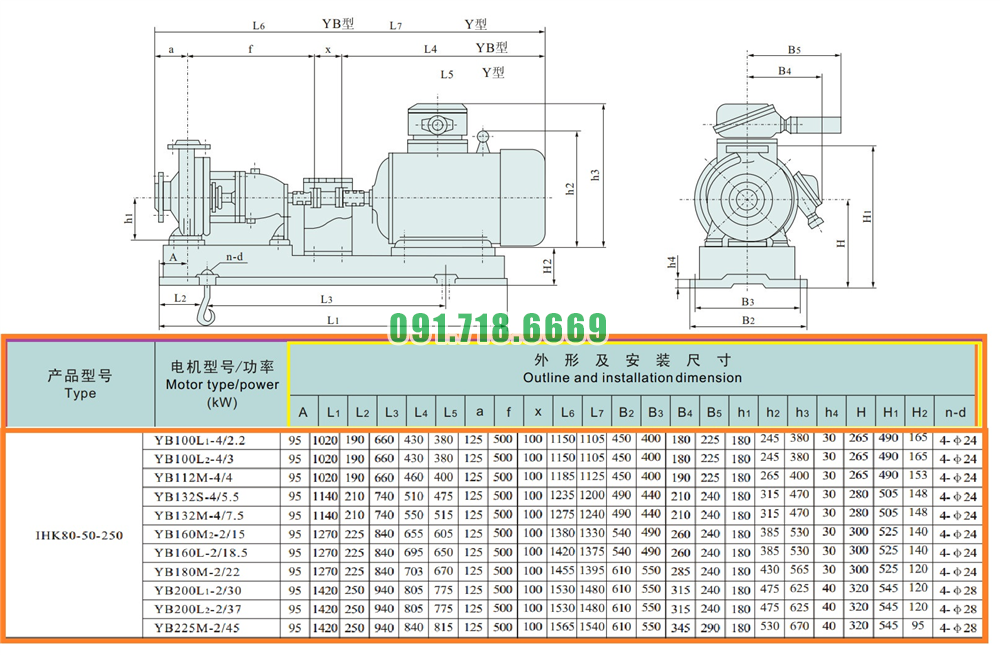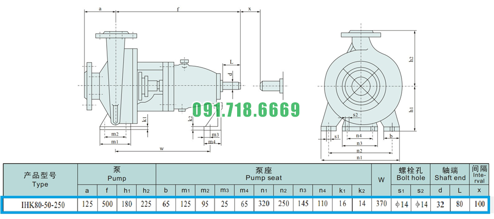 Kích thước của đầu bơm li tâm cánh hở công suất 30 kw model IHK80-50-250