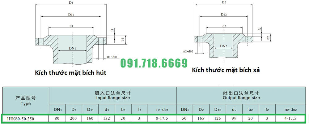 Kích thước mặt bích của bơm li tâm cánh hở công suất 30 kw model IHK80-50-250