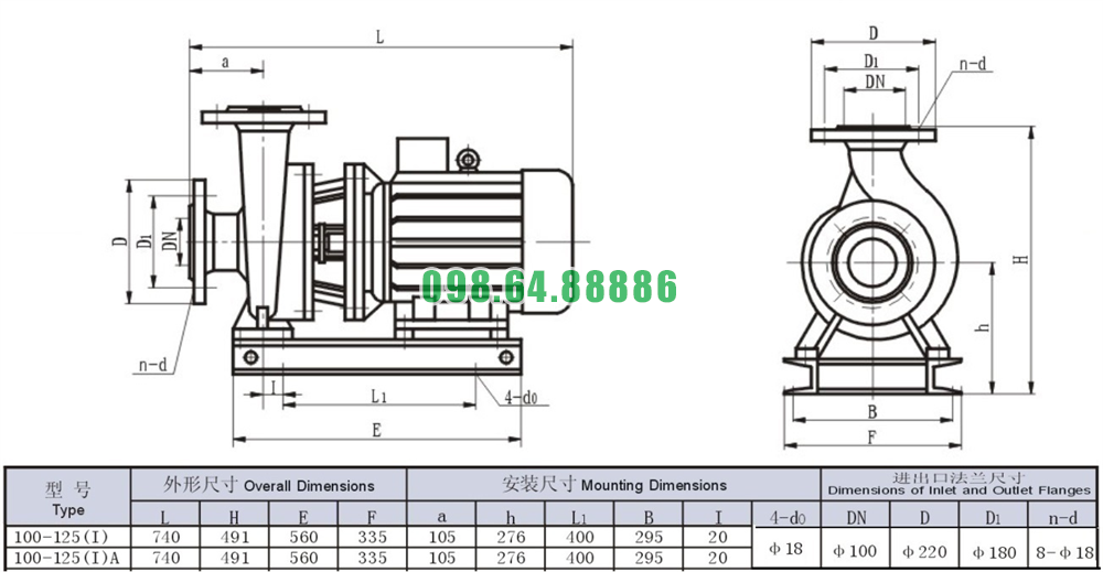 Bản vẽ cấu tạo và kích thước bơm nước trục ngang SLW100-ISW100-125-I lưu lượng 53.3 L/s