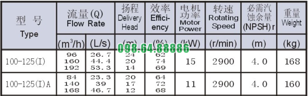 Bảng thông số kỹ thuật bơm nước trục ngang SLW100-ISW100-125-I lưu lượng 53.3 L/s