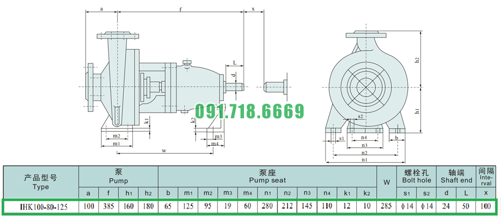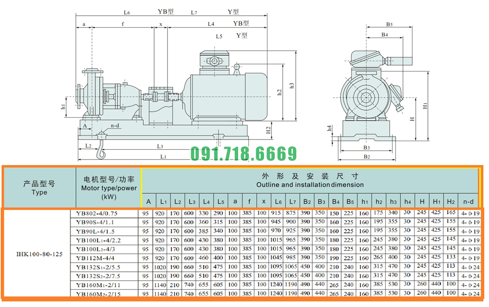 Kích thước của đầu máy bơm nước công nghiệp cánh hở IHK100-80-125