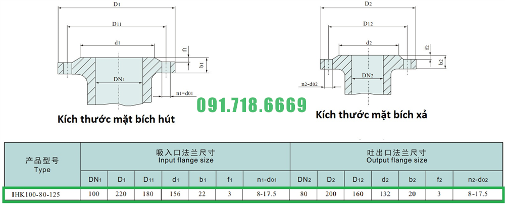 Kích thước mặt bích của máy bơm nước công nghiệp cánh hở IHK100-80-125