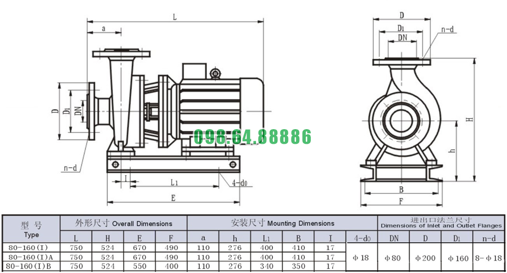Bản vẽ cấu tạo và kích thước bơm nước trục ngang SLW80-ISW80-160-I động cơ 11 kw lưu lượng 130 m3/h