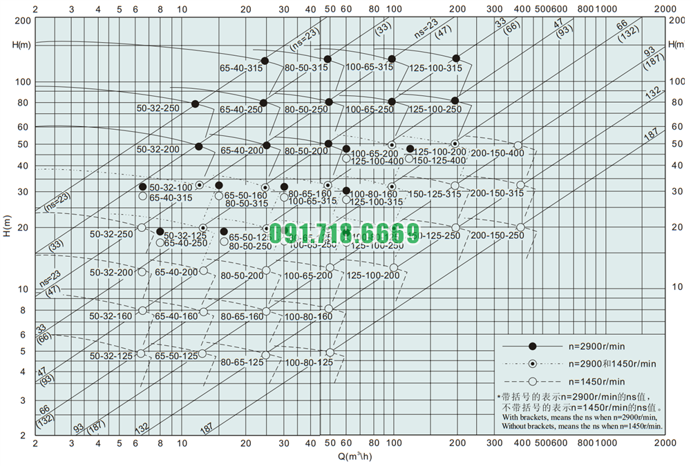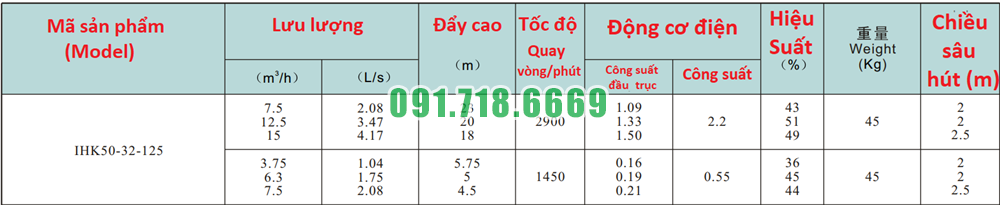 Bảng thông số lưu lượng của máy bơm cánh hở li tâm trục ngang IHK50-32-125 điện áp 380v