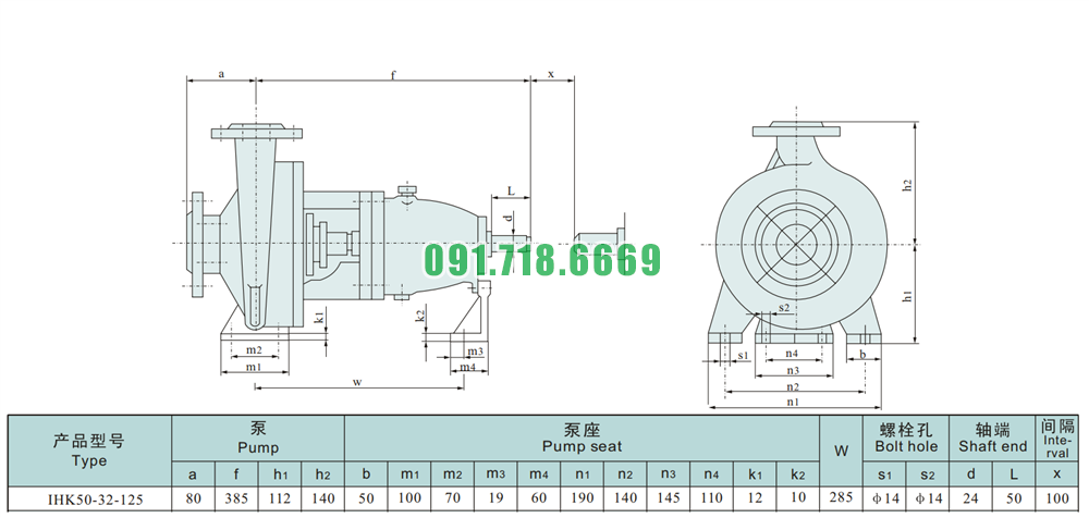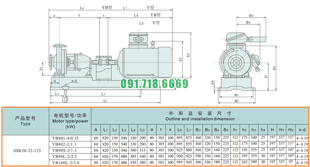 Kích thước của máy bơm cánh hở li tâm trục ngang IHK50-32-125 điện áp 380v