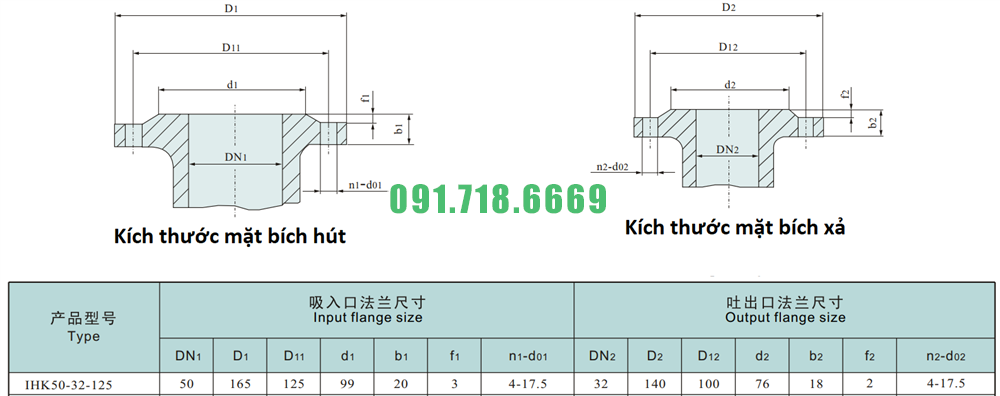 Kích thước mặt bích kết nối hút xả của máy bơm cánh hở li tâm trục ngang IHK50-32-125 điện áp 380v