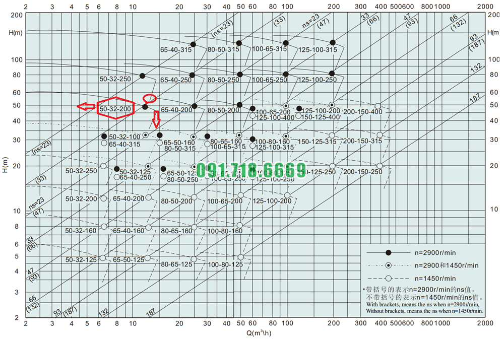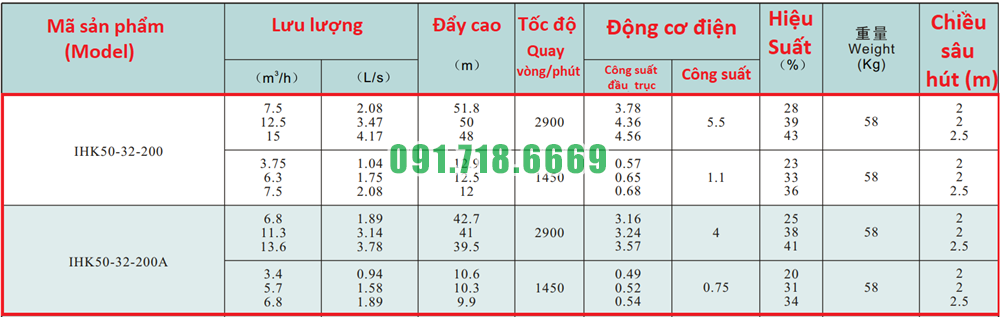 Bảng lưu lượng của máy bơm cánh hở li tâm trục ngang IHK50-32-200 điện áp 380v