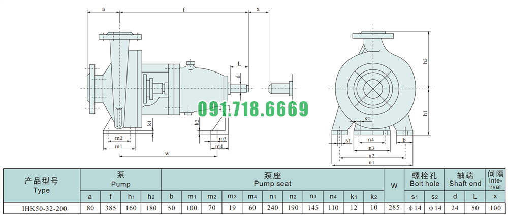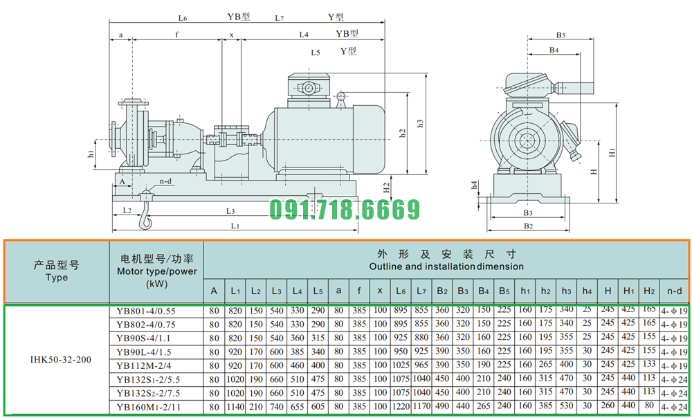 Kích thước của đầu máy bơm cánh hở li tâm trục ngang IHK50-32-200 điện áp 380v