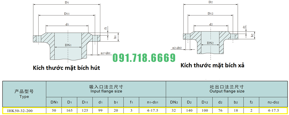 Kích thước mặt bích của máy bơm cánh hở li tâm trục ngang IHK50-32-200 điện áp 380v