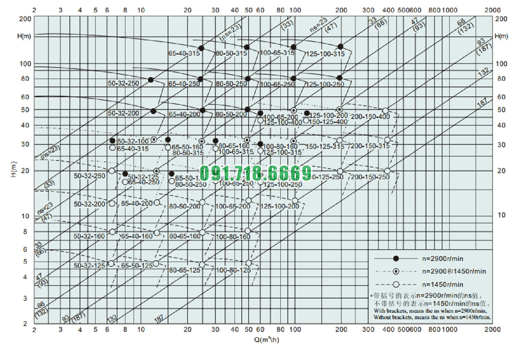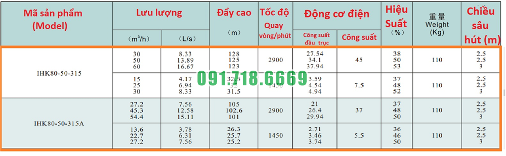 Bảng lưu lượng của máy bơm cánh hở li tâm trục ngang IHK80-50-315 điện áp 380v