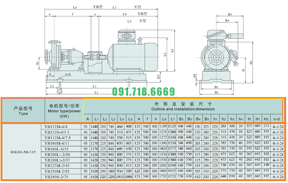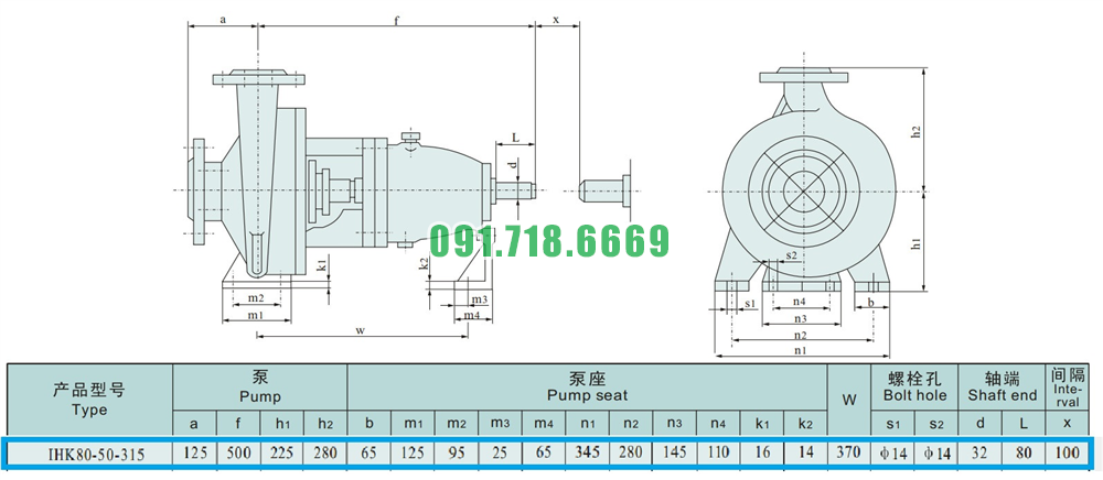 Kích thước của đầu máy bơm cánh hở li tâm trục ngang IHK80-50-315 điện áp 380v