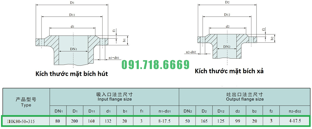 Kích thước mặt bích của máy bơm cánh hở li tâm trục ngang IHK80-50-315 điện áp 380v