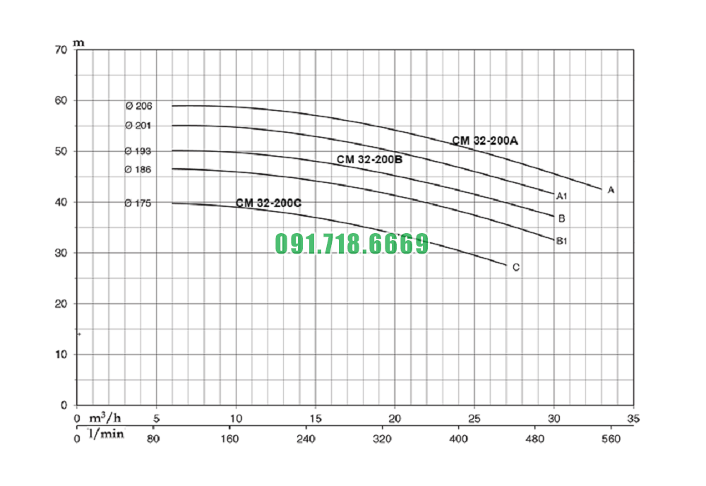 Đường cong hiệu suất máy bơm nước sạch li tâm trục ngang CM32-200A điện áp 380v