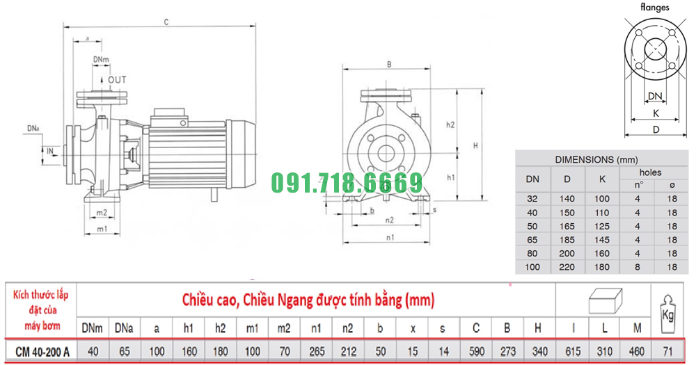 Kích thước máy bơm nước sạch li tâm trục ngang CM40-200A điện áp 380v