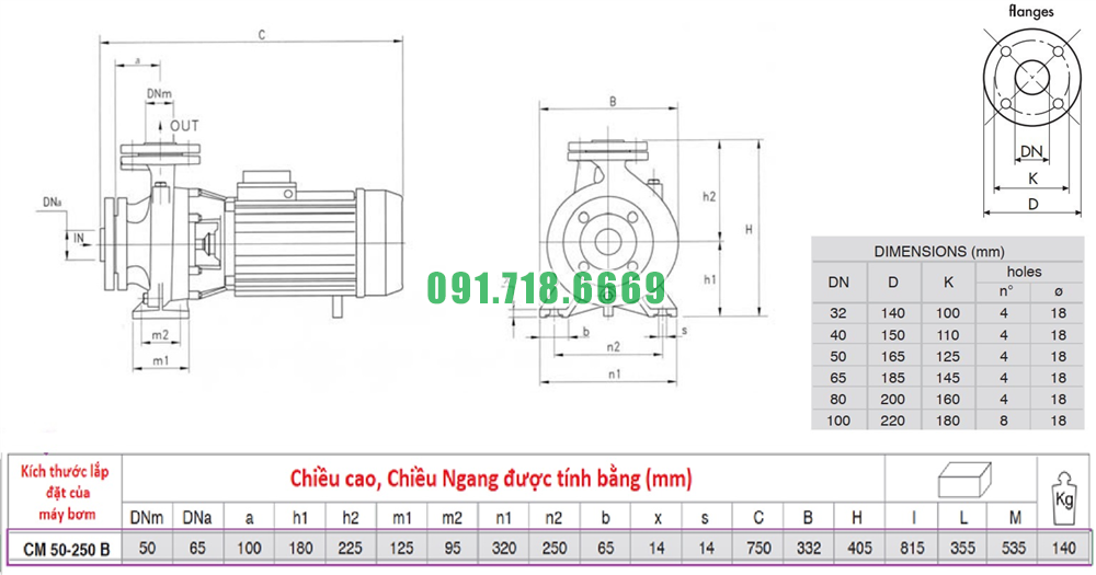 Kích thước máy bơm nước sạch li tâm trục ngang CM50-250B điện áp 380v