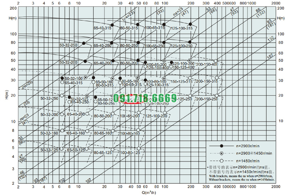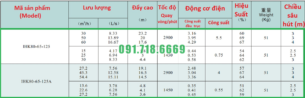Bảng lưu lượng của máy bơm nước li tâm trục ngang cánh hở IHK80-65-125 động cơ điện 5.5 kw