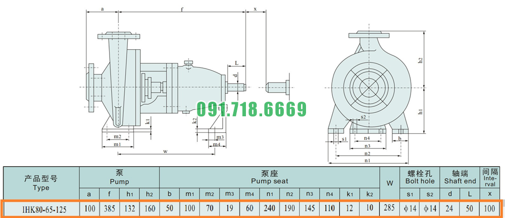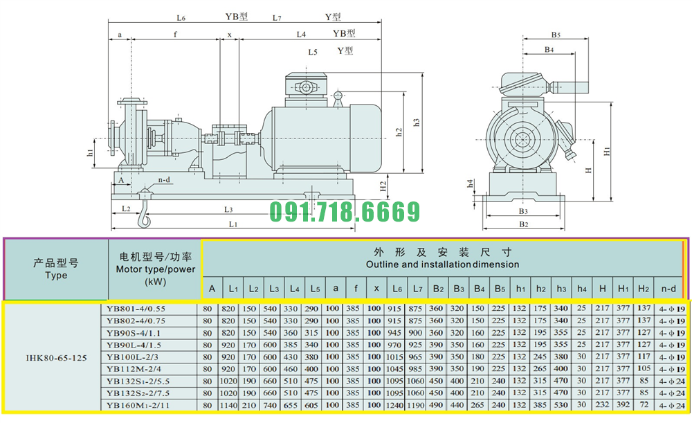 Kích thước của đầu máy bơm nước li tâm trục ngang cánh hở IHK80-65-125 động cơ điện 5.5 kw