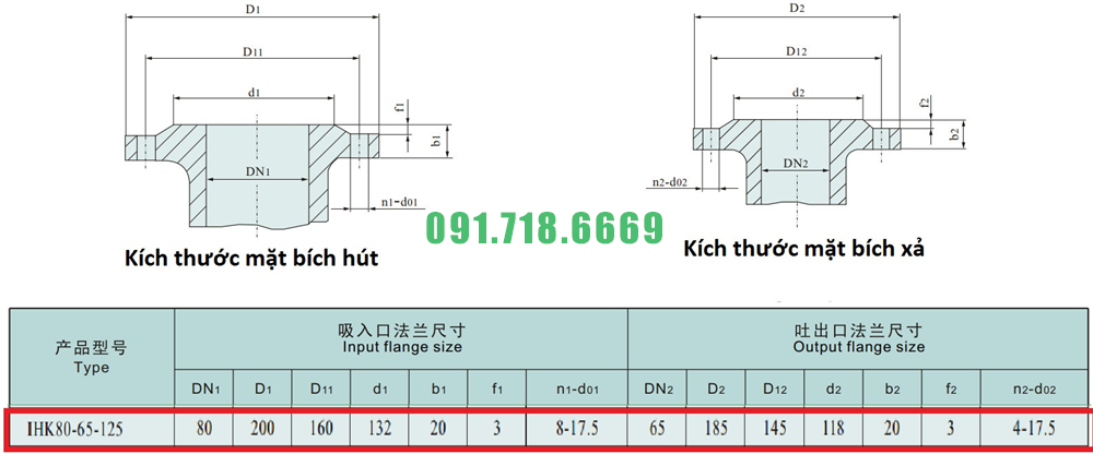 Kích thước mặt bích của máy bơm nước li tâm trục ngang cánh hở IHK80-65-125 động cơ điện 5.5 kw